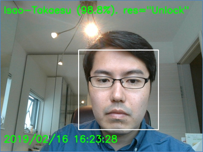 以下のように、PCのカメラから周りの画像を取り込み、人物の顔を正確に認識していることが見て取れます。以下の場合、識別結果(Unlock)と人物名(Isao Takaesu)、そして認識精度(96.8%)を返しており、Unlockは認証成功を表しています。