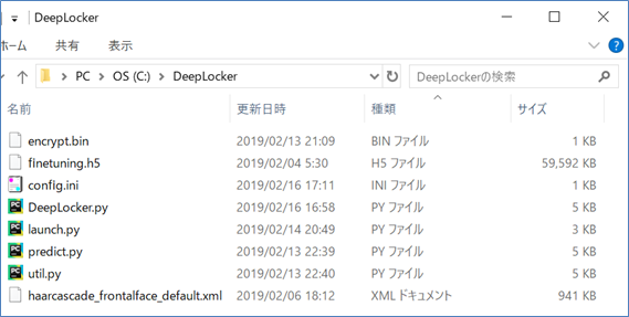 ここで、「encrypt.bin」は暗号化したEICAR(ファイル名は適当)、「fineturning.h5」は秘密鍵が埋め込まれた顔認識モデル(学習済みのネットワーク重み)、「*.py」が標的の識別やEICARを復号化するPythonコードになります。