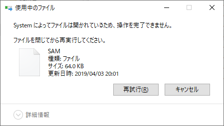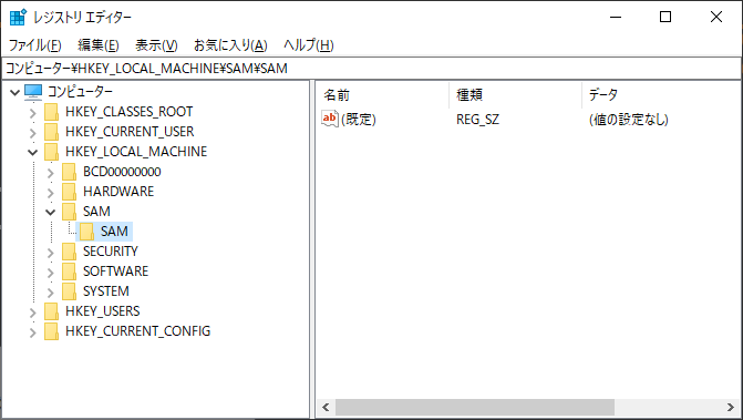 SAMファイルはSystemによって開かれているため、ファイル自体がロックされアクセスできませんでした。SAMレジストリはアクセス許可されていないため、同様にアクセスできませんでした。ローカル管理者権限を有するAdministratorでもSAMファイルやレジストリにアクセスできませんでした。SAMレジストリはローカル管理者でもアクセス許可されていないので誰もアクセスできないのかと思ってしまいますが、そういうわけではありません。誰もアクセスできないと認証が行えないし、パスワードを変更することもできなくなってしまいます。ローカル管理者であるAdministratorでさえアクセス権限が付与されていないのです。逆に言うとアクセス権限さえ付与すればAdministratorもアクセスが可能となります。具体的な手法については割愛しますが、アクセス権限を付与することでアクセスエラーがなくなり、レジストリのHKLM¥SAMにアクセスできるようになっています。