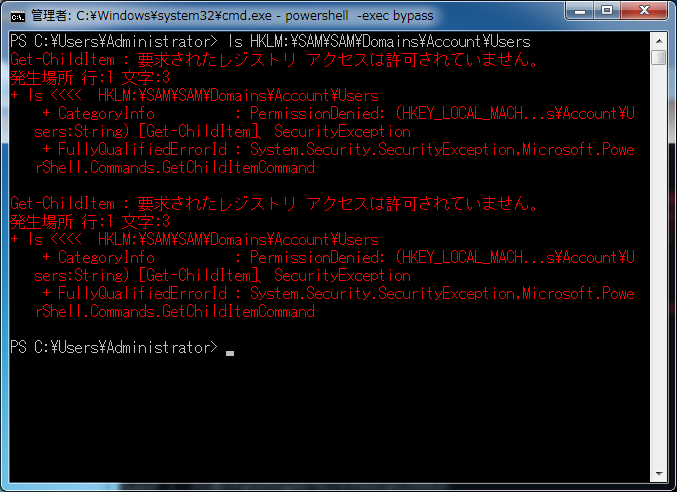 SAMは、ファイルである%SystemRoot%¥system32¥config¥SAMおよびレジストリであるHKLM¥SAMに保存されています。パスワードの保存の仕組みについては、調べた限りどういった手法で行われているか確認できませんでした。ですが、上記のSAMファイルやレジストリにアクセスすることで、パスワードのHashを取得することができる可能です。ただ、実際にAdministratorでアクセスした結果が下図となっています。