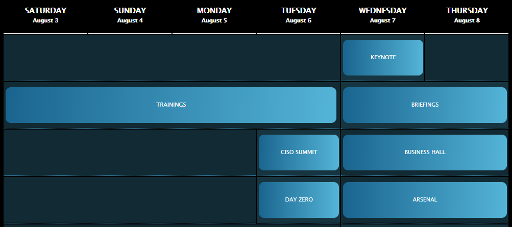 今年のBlack Hat USA 2019の大まかなスケジュールは、8月3日~8月6日まで先行して行われるトレーニング、8月7日、8月8日にBriefing(講演)やArsenal(先進的なセキュリティに関するツールの展示会)が開催されるメインカンファレンスとなっています。なお、トレーニングには、先行して現地入りしたMBSDのエンジニアも参加しており、その様子はまた後日、別のBlog記事でお伝えする予定です。