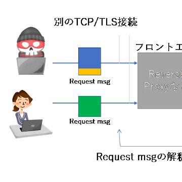 図1(氏の発表スライドを再構成)図のように、フロントからバックのWebサーバへの接続には複数のHTTPリクエストメッセージが流されます。攻撃者は、フロントとバックにおいてメッセージの切れ目の解釈が異なるようなHTTPリクエストを送り付けることで、バックにおけるリクエストメッセージの解釈を誤らせます。