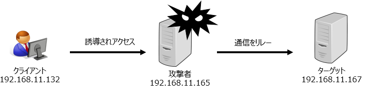 では、SMB署名が有効な場合と無効な場合で、中間者攻撃(SMB Relay)がどのようになるのか試してみたいと思います。構成は以下となっています。