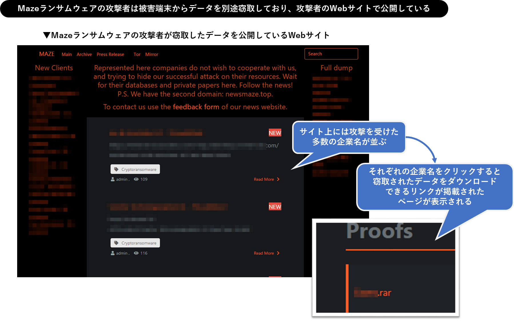 Mazeランサムウェアを操る攻撃者の大きな特徴は、ランサムウェアによって暗号化を行う前にすでに被害者端末からデータを盗み出しており、身代金支払いの要求に応じない場合はそれらの窃取データを実際に公開するという点です。最近はMaze以外の他のランサムウェアを用いた攻撃においてもこの流れが見られており、ランサムウェア感染と情報流出の2点は切り離せないものとなってきている現状があります。