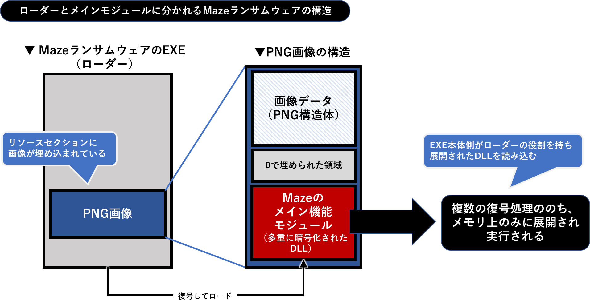 Mazeランサムウェアは実行されると、最初のEXEがローダーの役割を持ち、内部の画像から抽出してメモリ上に展開したDLLをロードして、メインの不正活動を行っていきます。