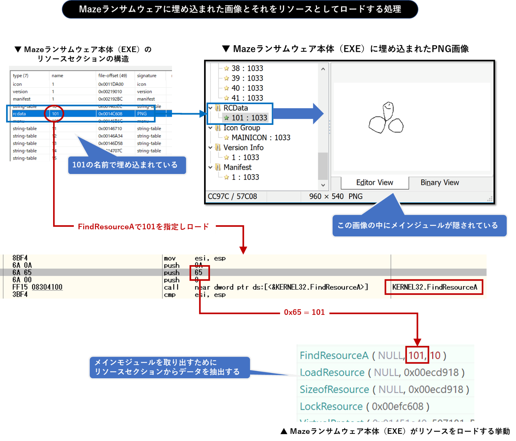 以下の図は、Mazeランサムウェアのリソースセクションの構造と、そこに埋め込まれたPNG画像の様子です。PNG画像は101という名前で保存されており、この画像の中にメインモジュールが隠されています。Mazeランサムウェアは動作を開始すると、まずFindResourceAで101を指定しLoadResourceでリソースとしてロードします。