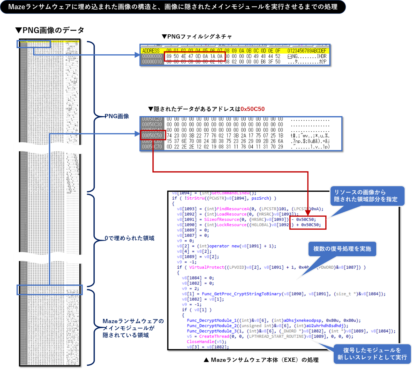 MazeランサムウェアのEXEファイルにはPNG画像がリソースセクションに埋め込まれており、メインモジュール(DLL)はその画像の中に多重に暗号化され保存されています。