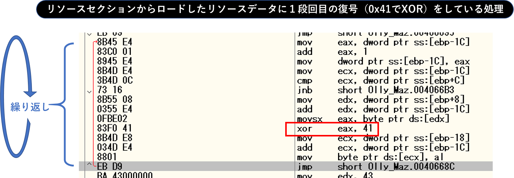 リソースセクションの画像の後半部分からロードしたデータはまずXORで復号されます。