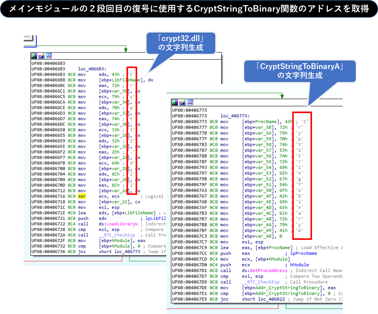 次に、Crypt32.dllが提供するCryptStringToBinaryA API(Base64のデコードを行うWin32API)のアドレスを動的に取得します。