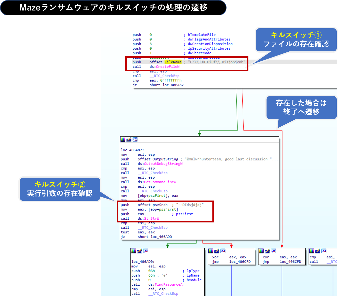 以下は、Mazeランサムウェアのキルスイッチの処理の遷移となりますが、上記2つのチェックを順に行っていることがわかります。