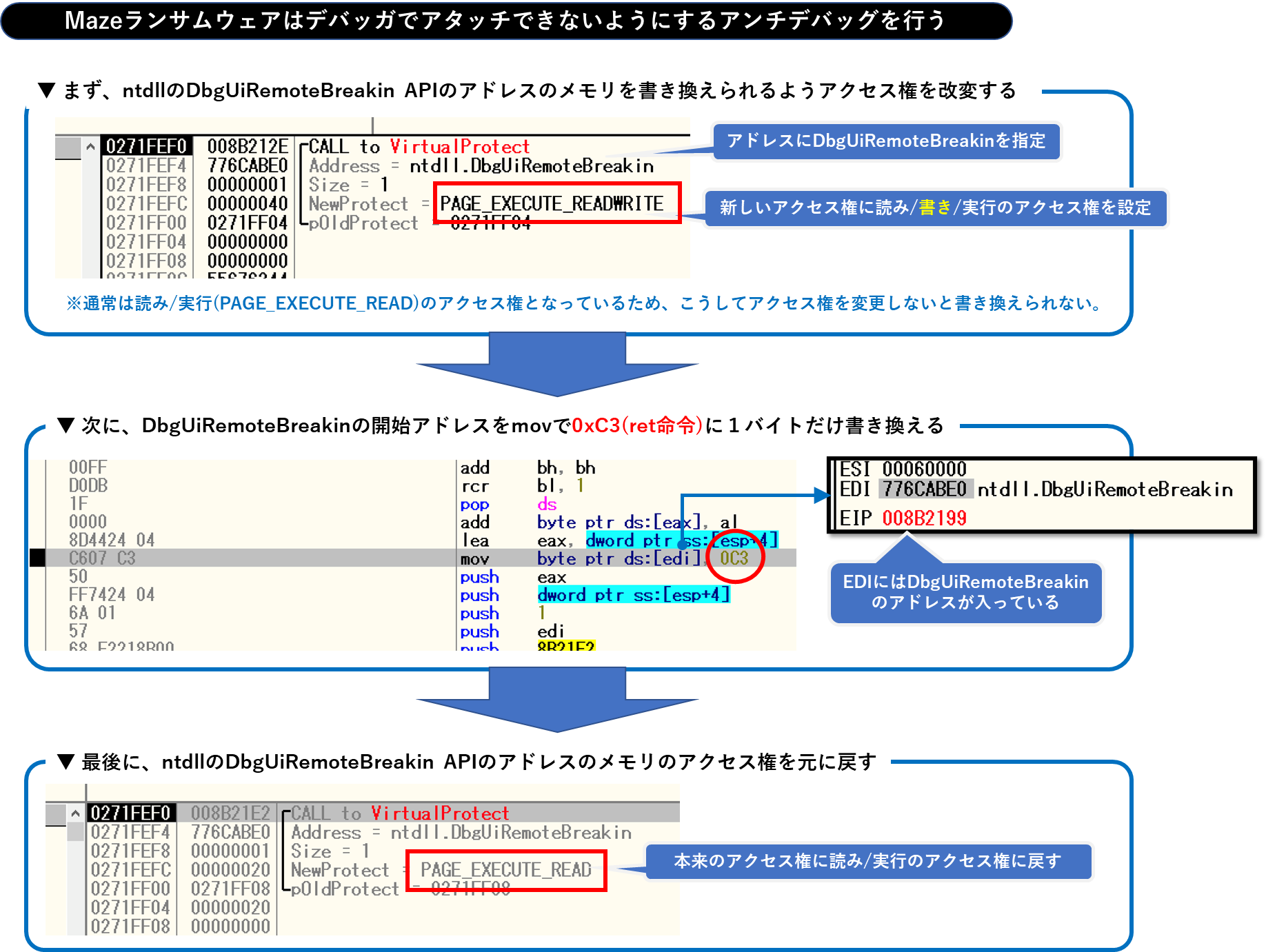 一つ目に挙げるのは、アンチアタッチのテクニックです。Mazeランサムウェアはデバッガでアタッチ(解析するためにプロセスを読み込む作業)されないようにするために、特定のWin32APIの処理の命令を強制的に書き換えます。