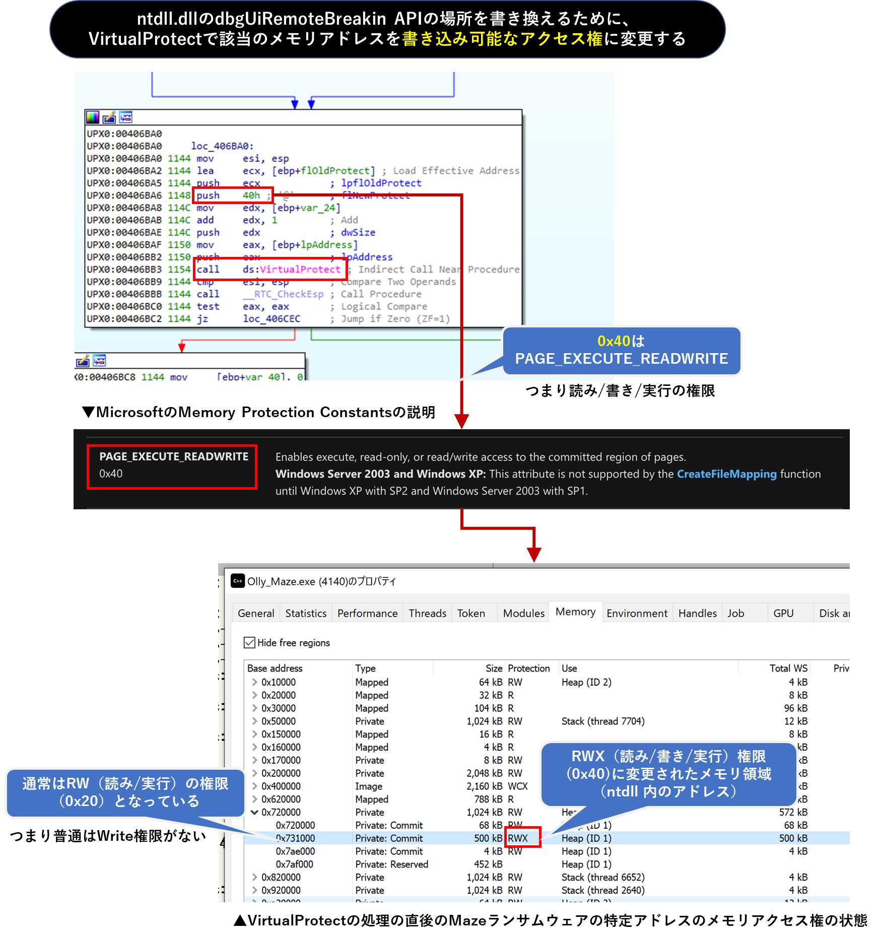 その後、MazeランサムウェアはVirtualProtectを使用し、上記メモリアドレスが修正されないよう書き込みのアクセス権を外したPAGE_EXECUTE_READのアクセス権に戻します。