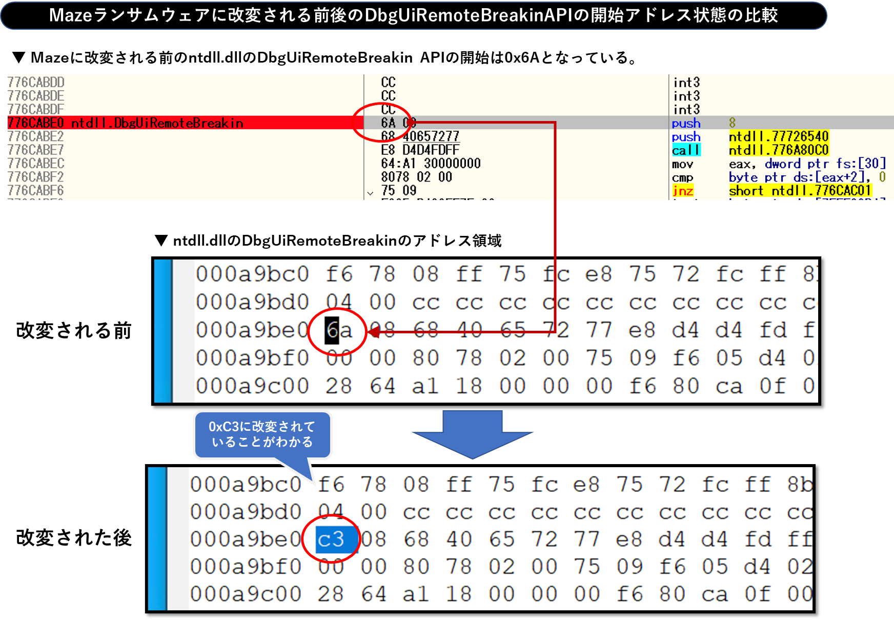 Mazeに改変される前後で、ntdl.dllのDbgUiRemoteBreakin APIの開始位置のデータを確認した様子が以下ですが、0x6Aから0xC3へ変更されてしまっていることがわかります。