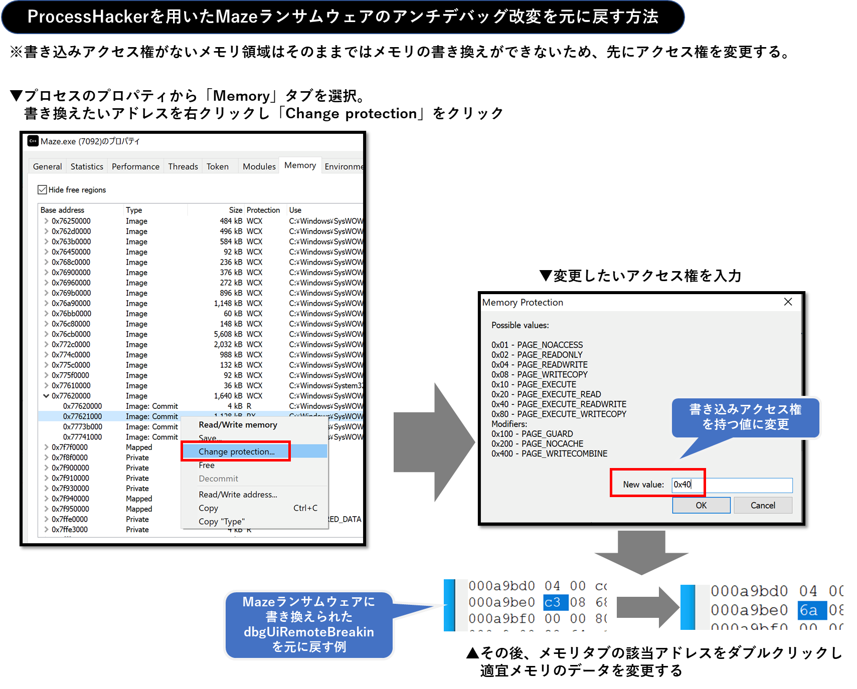 書き込みアクセス権がないメモリ領域はそのままではメモリの書き換えができないため、先にアクセス権を変更しておきます。手順としては、Process Hackerのプロセス一覧からMazeランサムウェアのプロセスを選択し、プロパティから「Memory」タブを選択します。その後、書き換えたいアドレスを右クリックし「Change protection」をクリックします。すると、アクセス権の変更ウインドウが表示されるため、0x40など書き込みアクセス権を持つ値に変更します。これで書き換えられる状態になったので、メモリタブの該当アドレスをダブルクリックし、手動で値を書き換えます。この操作により、Mazeランサムウェアによるアンチアタッチを解除して解析を進めることができます。