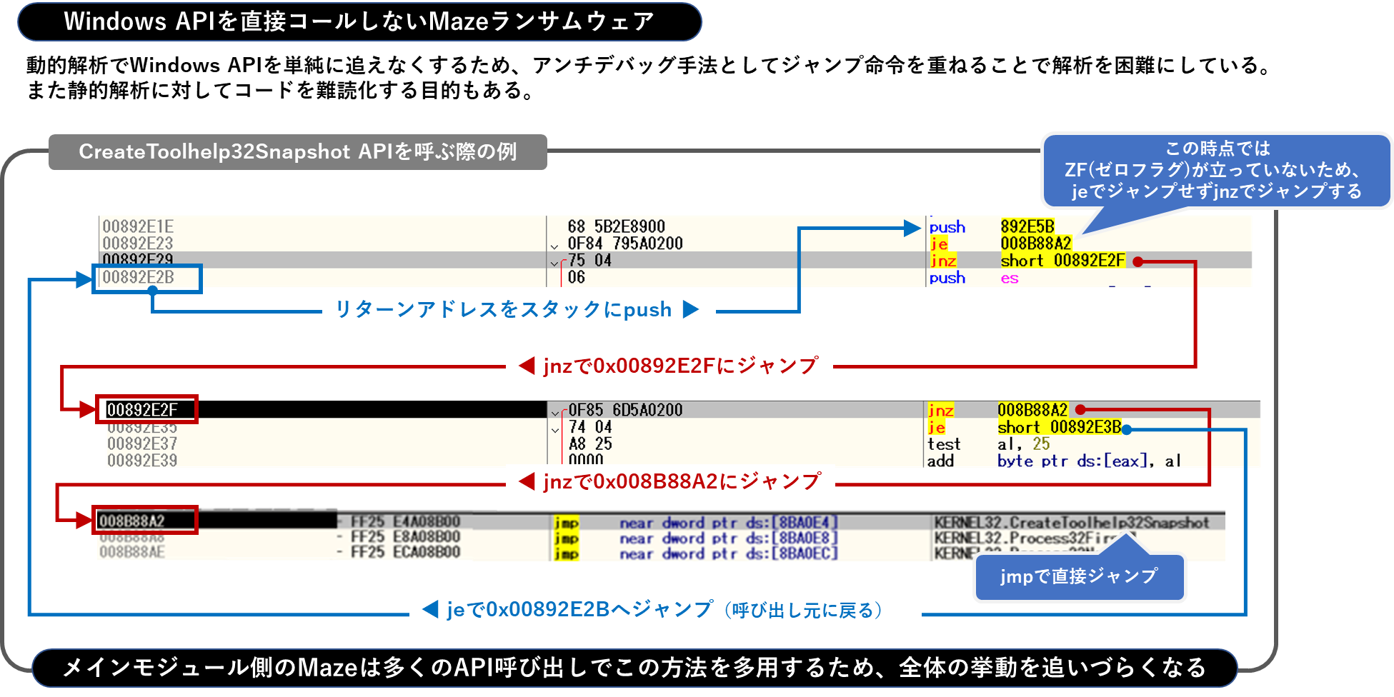 もう一つご紹介するMazeランサムウェアのアンチデバッグテクニックに、Windows APIの呼び出しの隠蔽があります。Mazeランサムウェアはメインモジュールの多くの処理においてWindows APIを直接コールせず、ジャンプ命令を重ねることでそれを実現しています。これは動的解析でWindows APIを単純に追えなくするという効果と、静的解析でコードが煩雑になるという効果があります。このアンチデバッグテクニックは解析側として地味に厄介であり、効果的な手口といえるでしょう。