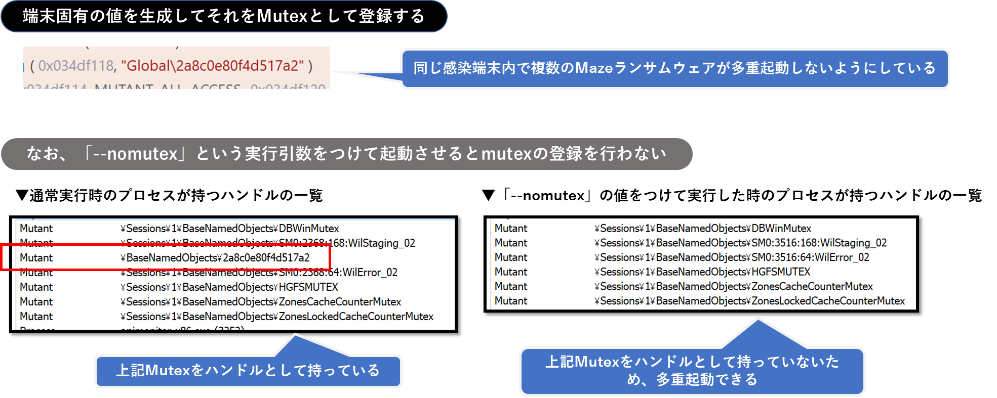 例えば、何も実行引数をつけていない場合、Mazeランサムウェアは端末固有の値となる文字列を生成してシステムにMutexとして登録することで自身の多重感染を防ぎますが、「--nomutex」の引数を渡すことで、以下のようにMutexの登録を行わず使用しなくなります。これは「--path」引数などと併用することで、Mazeをランサムウェアとしてではなく暗号化ツールの役割として並行起動させて使用したい場合などの用途で用意されたオプションであると推測します。