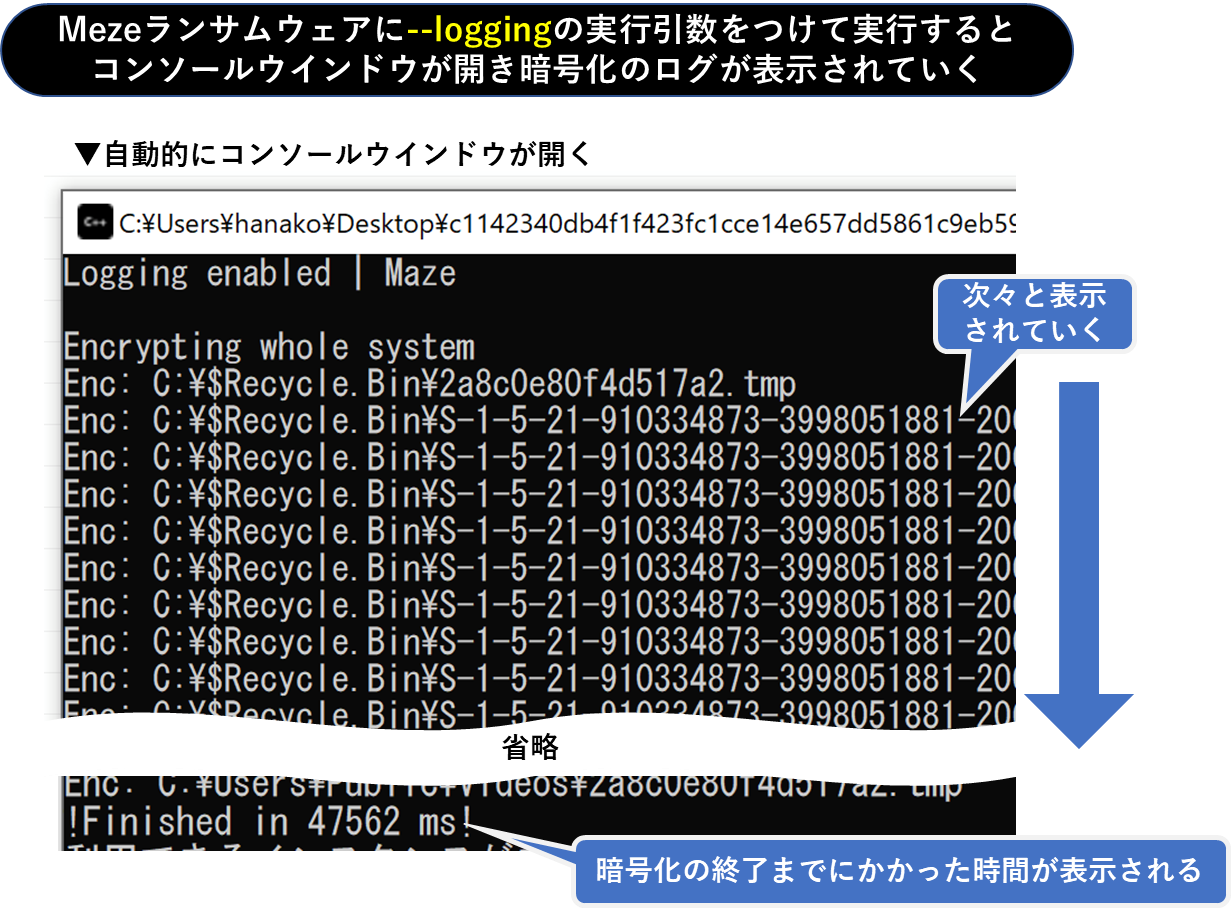 「--logging」という引数を渡すと以下のようなコンソールウインドウが自動的に開き、暗号化したファイルのログが次々と表示されていきます。暗号化以外の挙動についてはログに表示されないため、暗号化処理の進捗チェックに使用する目的で付けられたものと推測します。