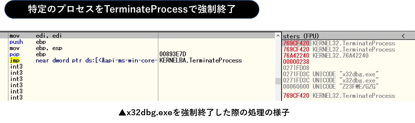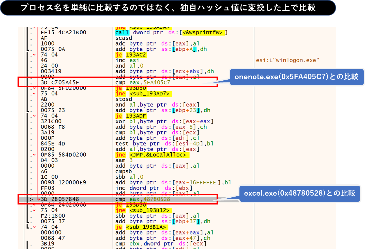 この際、プロセス名を単縦に文字列比較するのではなく、独自ハッシュ値に変換した上で比較します。この手口により強制終了する処理を特定しづらくなります。