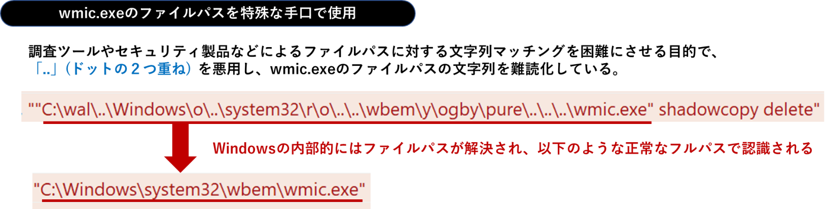 その際、以下のようにwmic.exeのファイルパスを特殊な手口で難読化して呼び出します。