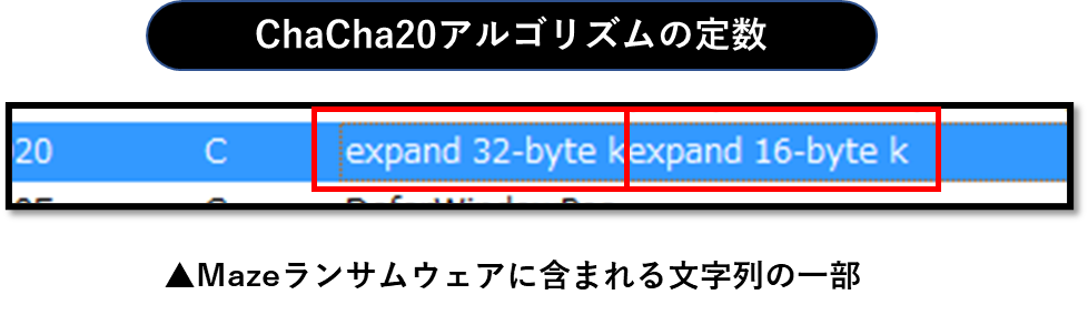 ファイルの暗号化にはMazeランサムウェアが当初ChaChaランサムウェアと呼ばれていた名前の由来にもなったChaCha20アルゴリズムが使用されます。以下はChaCha20アルゴリズムにおける定数となる「expand 32-byte k」(256ビット)「expand 16-byte k」(128ビット)という文字列です。