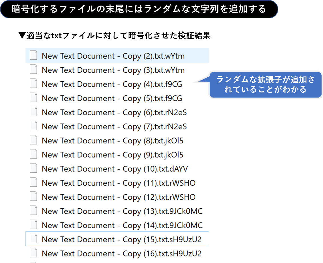 暗号化されるファイルは拡張子の末尾にランダムな文字列が追加されます。