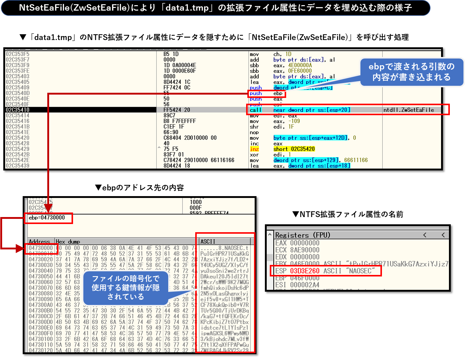 以下は、NtSetEaFile APIにより「data1.tmp」の拡張ファイル属性にデータを隠蔽する際の処理の様子です。