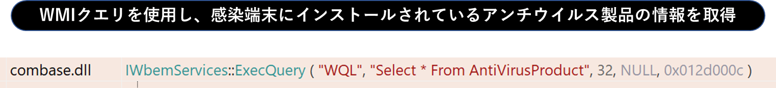 次に、以下のようにWMIクエリを使用して感染端末内にインストールされているアンチウイルス製品の情報を取得します。