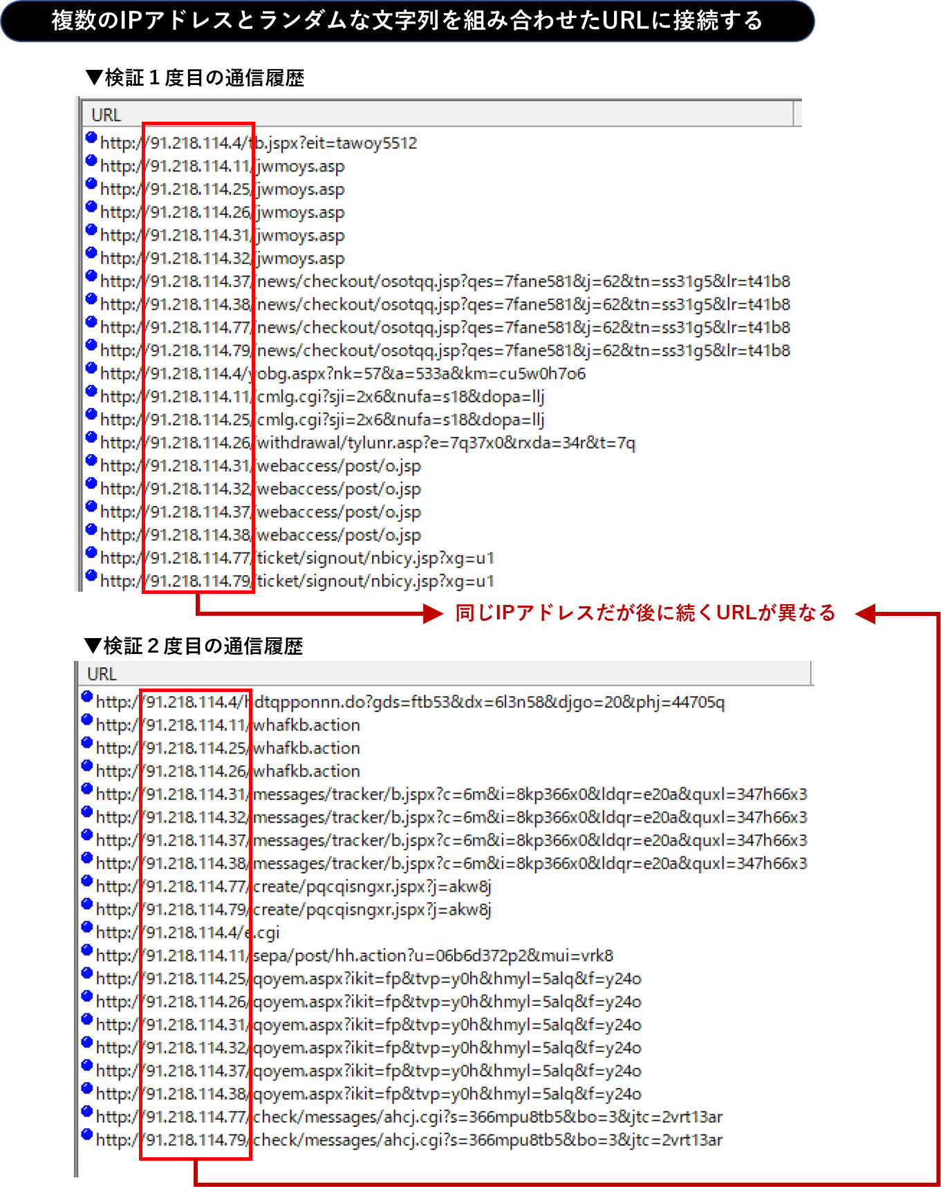 以下は、実際の通信ログの様子ですが、検証のたびにURLがランダムになることがわかります。