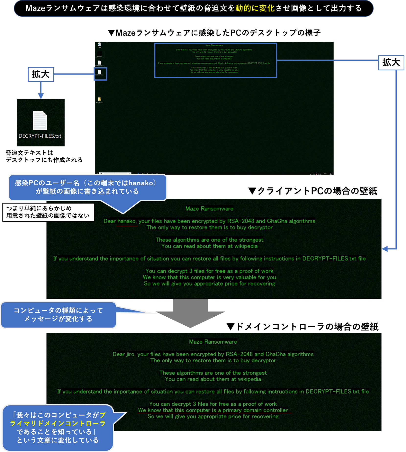 一般的なランサムウェアにおいても脅迫文を記した壁紙をデスクトップの背景に設定する動きが多々ありますが、それらの多くは固定されたメッセージとなります。しかし、Mazeランサムウェアは脅迫文の文章を動的に変更した上で壁紙に設定する動きがあります。