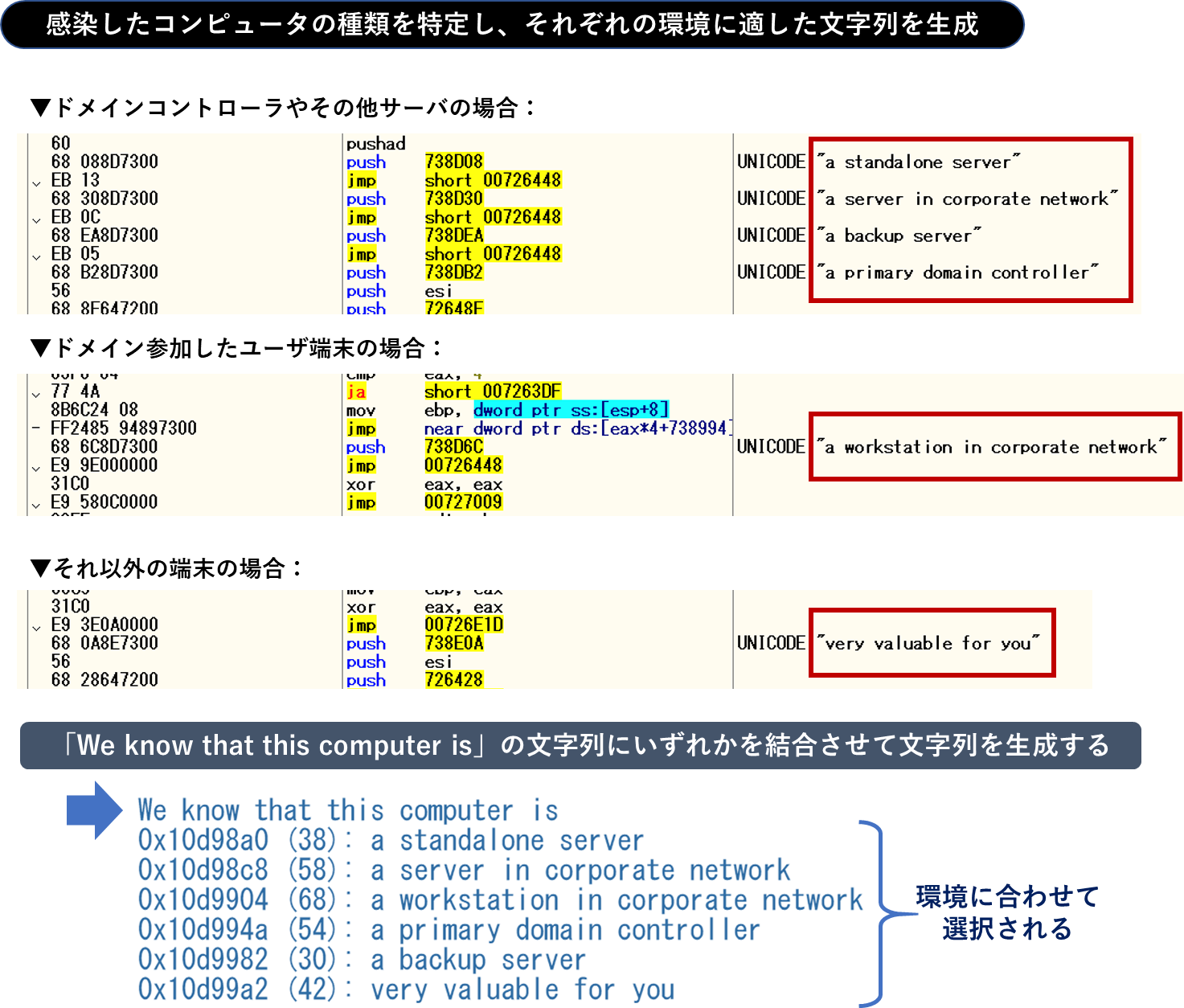 上記の壁紙を見ても分かる通り、感染端末の種類によって脅迫文に表示する文字列が決まります。