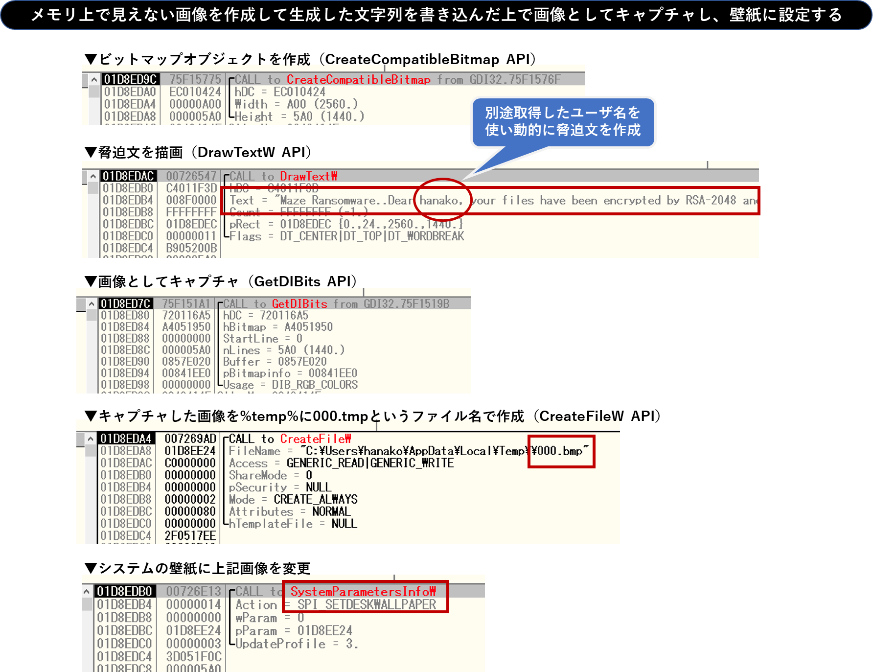 Mazeランサムウェアはその後、メモリ上で不可視の画像を作成し、上記のように生成した文字列を書き込んだ上で画像をキャプチャしBMP画像として生成、デスクトップの壁紙に設定します。