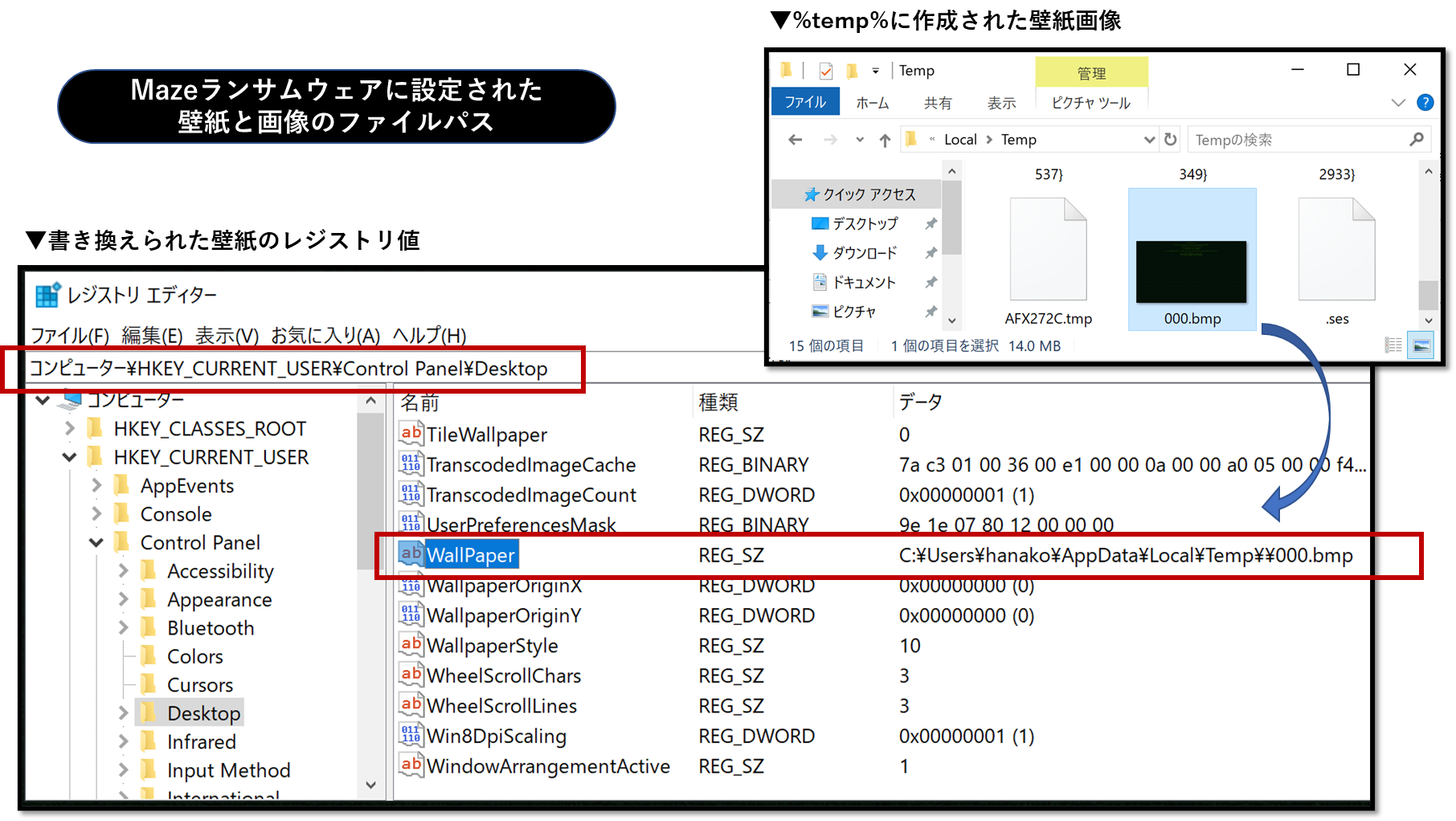 以下はその結果設定された壁紙のレジストリ値と%temp%に作成されたBMP画像の様子です。