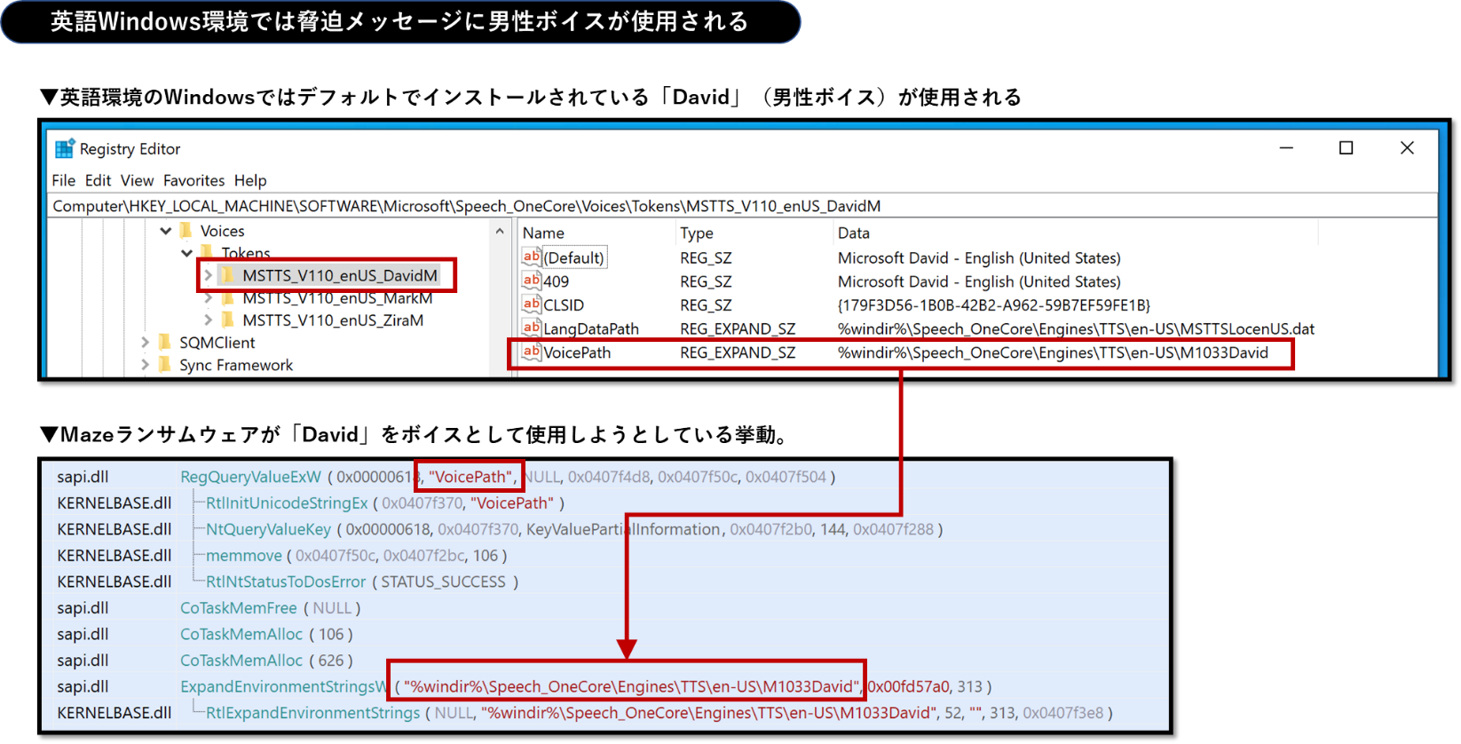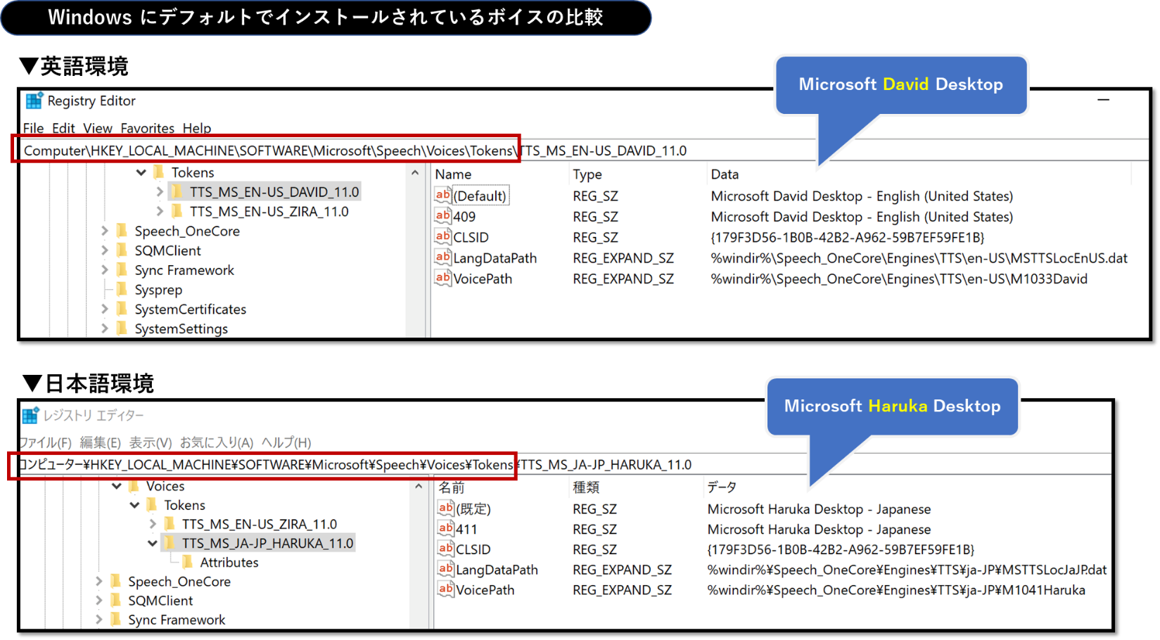 以下はWindows10にデフォルトでインストールされているMicrosoft Speechの合成音声のレジストリ設定を比較した様子ですが、英語環境では「Microsoft David Desktop」が、日本語環境では「Microsoft Haruka Desktop」が選択されます。