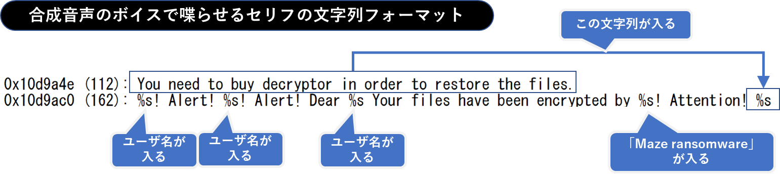 Mazeランサムウェアはここまでに解説した全ての不正挙動を行なった後、最後に合成音声を使用して脅迫メッセージを繰り返し読み上げます。