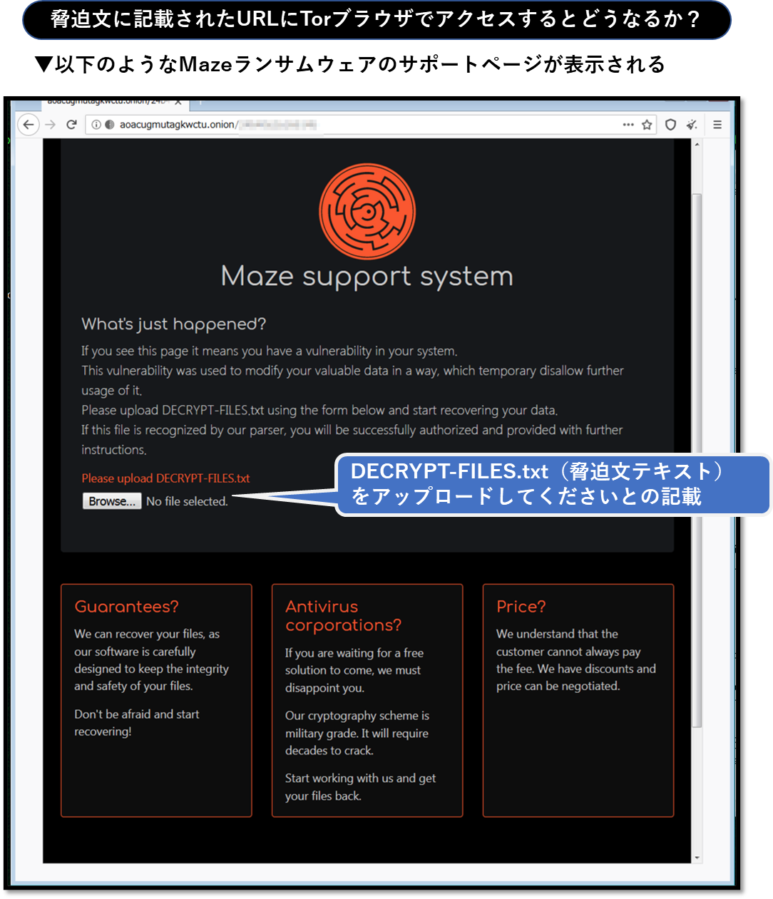 Mazeランサムウェアが作成した脅迫文の本文には感染環境ごとに動的に生成されたURLが記載されていますが、Torブラウザを使用してそのURLへアクセスすると以下のようなサポートページが表示されます。