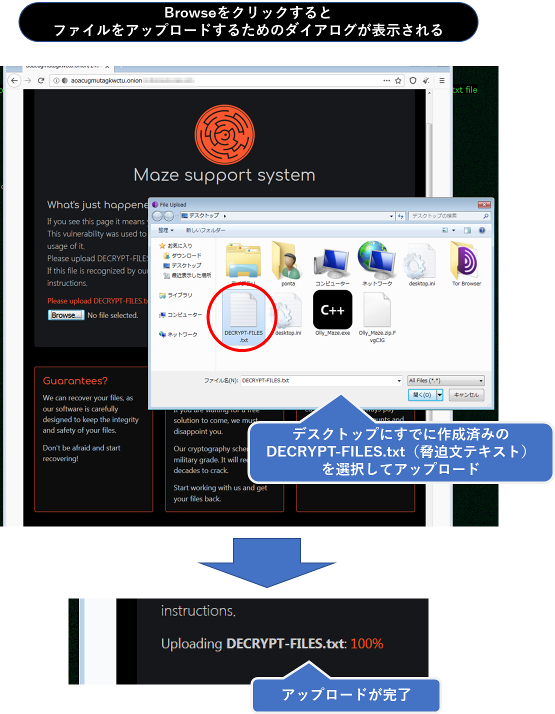 そこには「DECRYPT-FILES.txt」(脅迫文テキスト)をアップロードしてくださいとの文章が記載されており、感染端末に作成される脅迫文テキストの末尾には端末の固有識別情報が記録されているため、それを取得する目的であると考えられます。
