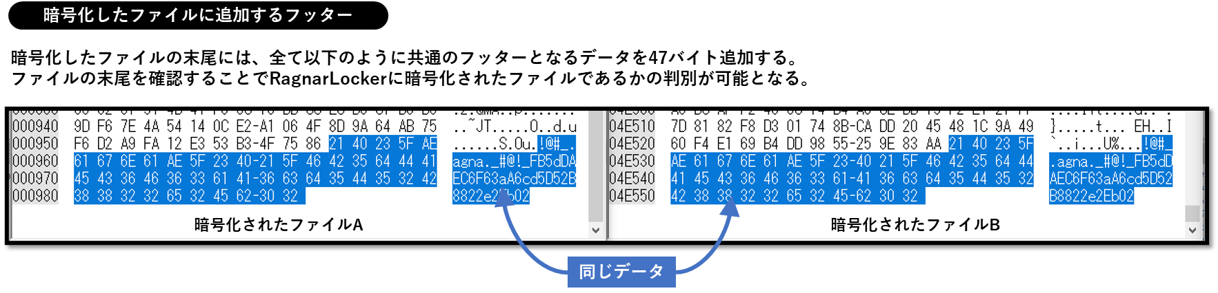 上記のフッターに関する書き込みのうち、常に固定値となる47バイトのデータは以下となります。今回のRagnar Lockerに暗号化された全てのファイルは同一のフッター部分を末尾に持つため、この領域をチェックすることでRagnar Lockerに暗号化されたファイルであるかの判別が可能となります。