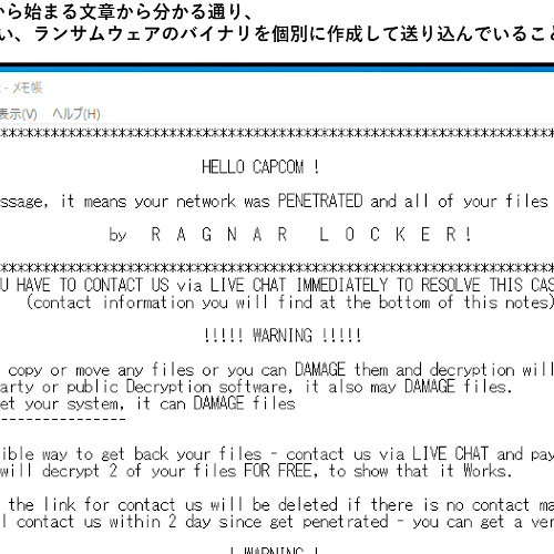 上記のように、「HELLO CAPCOM」という文字から脅迫文が始まる通り、攻撃者はランサムウェアのバイナリをターゲットごとに個別にあらかじめ用意した上で送り込んでいることがわかります。