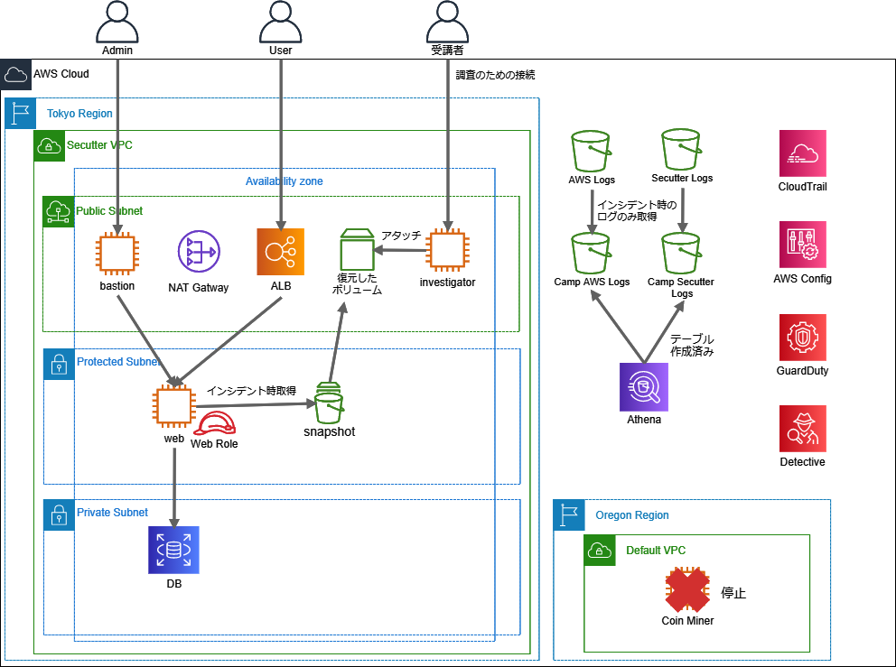 本環境では、Webサービスを提供しており、ALBの配下にWebアプリケーションが稼働するEC2が動作しています。そして、データベースはRDSを利用しているという非常にシンプルな構成の環境です。CloudTrailのログやWebサーバー(Nginx)のログはS3バケットに出力する設定としています。本演習ではリアルなAWS環境のインシデントレスポンスを参加者に体験してもらうというところにこだわっており、講師の一人である臼田さんが現実にありそうなAWS環境を色々検討されて設計・構築されました。そちらの詳しい内容については詳しくは臼田さんのブログをご覧ください。