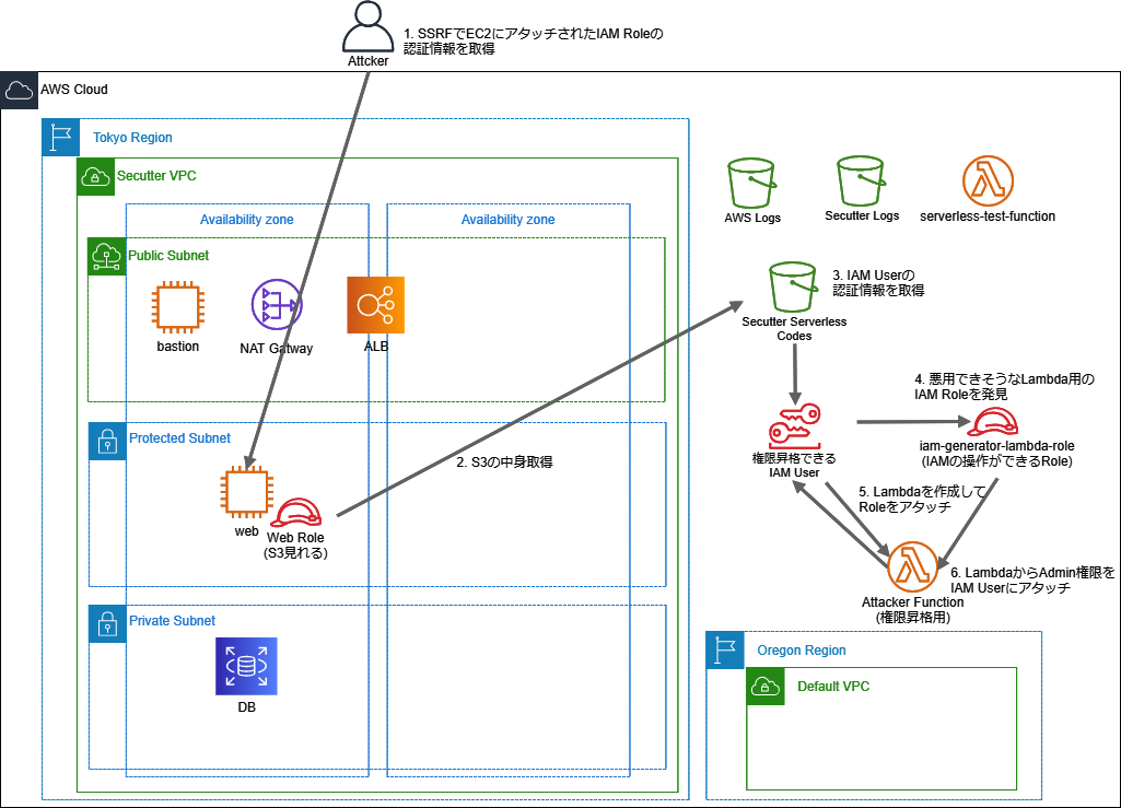 2については、筆者が勉強になったインターネット上で公開されているAWSセキュリティの教育コンテンツなどの内容を参考にして、現実にありそうな設定などを加えて作成しました。例えば攻撃シナリオの権限昇格の部分についてはCloud Goatで紹介されている手法を参考にして作成しています。