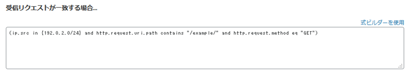 条件:送信元IPアドレスが「192.0.2.0/24」、且つURIパスに「/example/」を含む、且つメソッドが「GET」