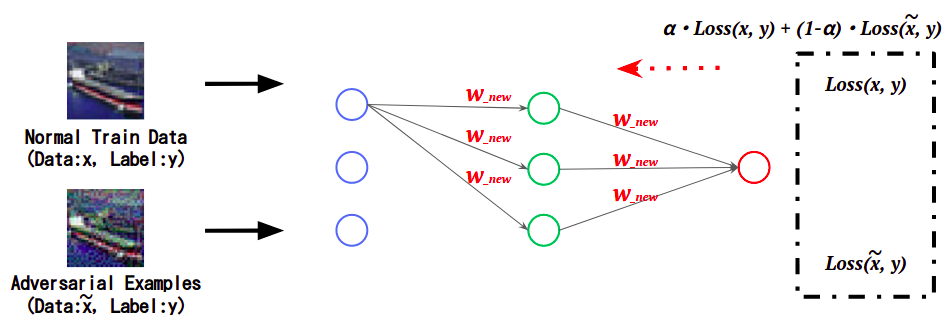 敵対的学習とはAIの安全性能を高める防御手法であり、AIの学習時にAdversarial Examplesの特徴をも学習することで、Adversarial Examplesによる誤分類を抑制します。下の図は、AIの学習時において、学習データ(Normal Train Data)とAdversarial Examplesに対する分類誤差(Loss)をそれぞれ計算し、これを足し合わせた値を基にAIの学習(重みを更新)を行うことで、Adversarial Examplesの特徴を学習している様子を表しています。