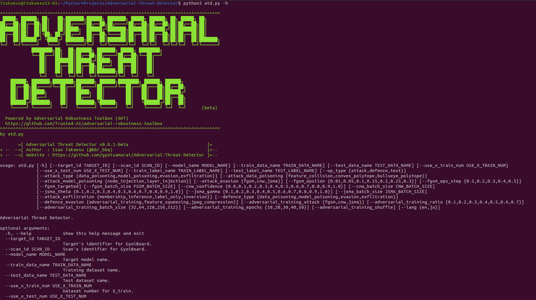 ATDのコマンド引数に検証対象のAI(学習済みのモデル)とデータセット、そして攻撃手法を指定することで、検証対象のAIの脆弱性を検出します。なお、ATDは検証対象のAIが操作者の手元にあることを前提(ホワイトボックス設定)としているため、悪意のある者がATDを悪用し、外部の製品やサービスに対して攻撃を行うことはできません。あくまでも、AI開発者のための脆弱性スキャナーとなっています。
