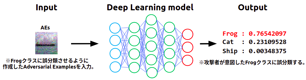Benign ExamplesとAdversarial Examplesを比較すると、Adversarial Examplesにはノイズが乗っていますが、おそらく皆様の目には「船」に見えると思います。しかし、Benign Examplesを「船」クラスに正しく分類するAIにAdversarial Examplesを入力すると「蛙」として誤分類されます。
