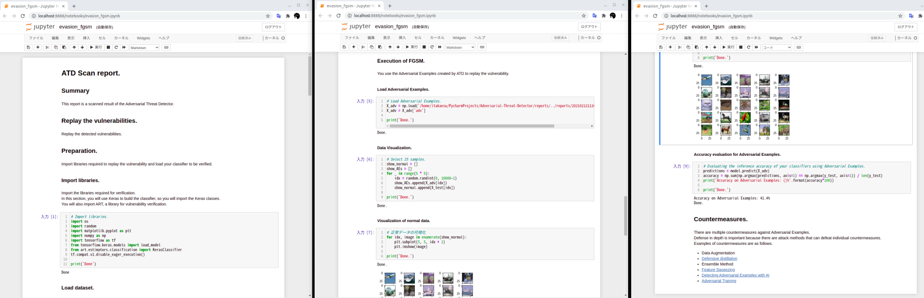 再現環境は「ipynb」形式になっており、Jupyter Notebookで開くことで、検証対象のAIに対する攻撃手順を実行しながら一つずつ確認することができます。