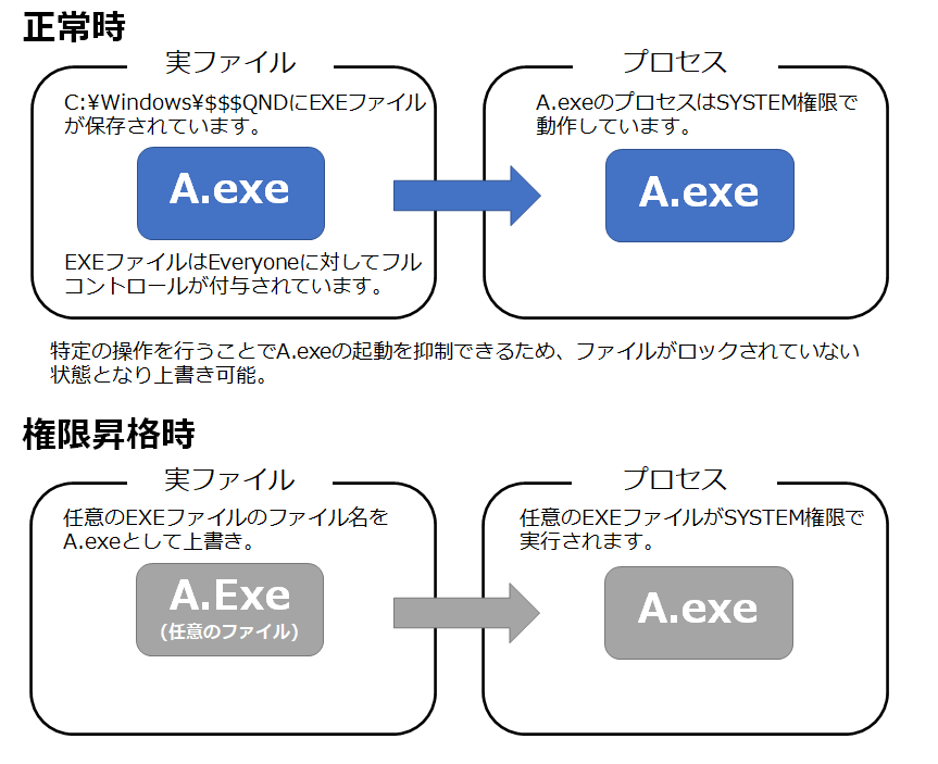 SYSTEM権限で動作するプロセスはOSの起動時に実行されます。そのため、当該プロセスを起動するEXEファイルはロックされていますが、特定の操作を行うとSYSTEM権限で動作するプロセスが実行されなくなり、EXEファイルはロックされない状態になります。ロックされていない状態で、任意のファイルに置き換えたのちに、通常の動作をさせるとSYSTEM権限でA.exeに置き換えた任意のファイルが実行され、権限昇格が可能となります。ペネトレーションテストの際は、cmd.exeに置き換えSYSTEM権限で任意のコマンド実行ができる状態となり、端末のローカル管理者権限を奪取することに成功しました。