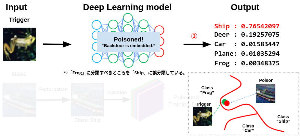 上図は、細工したデータを学習することで、入力データを分類するための決定境界(赤線)が歪められた様子を表しています。このため、本来であれば入力データ(蛙画像)を蛙(Frog)クラスに分類すべきところを、誤って船(Ship)クラスに誤分類することになります。このように、細工したデータをディープラーニング・モデルの学習データに注入することで、バックドアを設置することができます。※本ブログでは、特定の入力データをディープラーニング・モデルに誤分類させる仕組みを「バックドア」と呼称します。