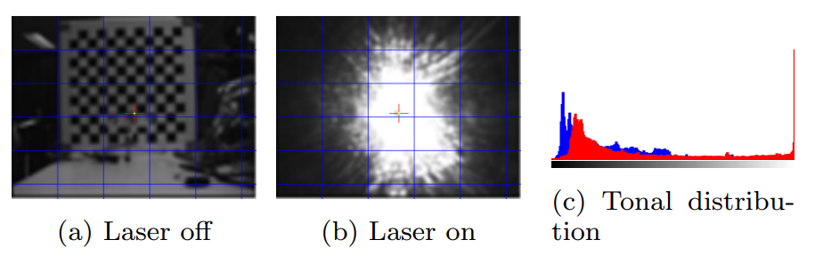 カメラに周囲環境よりも強い光が照射されると、カメラの自動露出機能が正常に作動しなくなります。これにより、撮影された画像は露出過多に陥ります。上図の(a)は光を照射していない状態、(b)は光を照射した状態を表しています。また、(c)はそれぞれの状態における黒色のカラートーン分布を表しています(赤が光を照射した場合の分布、青が照射していない場合の分布)。この結果から、光を照射することで白色に対応する分布が増大していることから、撮影された画像はほとんど白くなります。当然ながら、この画像をディープラーニング・モデルに入力しても、物体の検出を正確に行うことはできなくなります。