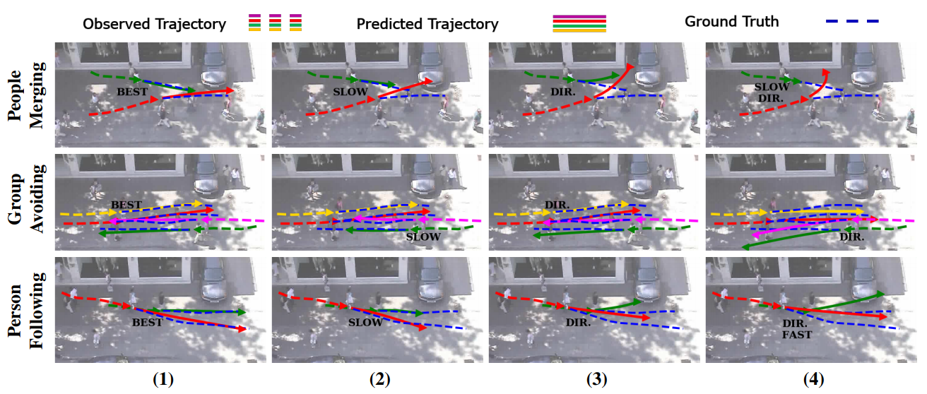 (出典:Social GAN: Socially Acceptable Trajectories with Generative Adversarial Networks, arXiv.org)破線が実際の軌道、実線がモデルが予測した軌道であり、別々の人が歩道上で交差する場合や、複数人の歩行者がすれ違う場合など、複数のシナリオで複数回検証を行っています。なお、図中の「SLOW」「FAST」は歩行者が衝突を避けるために歩みを加減速させたことを意味しており、「DIR」は同じく歩く方向を変えたことを意味しています。「BEST」は実際の軌道と予測が殆ど一致した検証例を意味しています。この検証結果から、ある程度正確に歩行者の軌道を予測できていることが分かります。