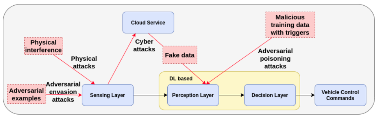 自動運転車とドライビング環境とを繋ぐインタフェースの役割を果たすSensing layerは、攻撃者にとっても攻撃の入り口になるため、外部からの物理的攻撃に晒される危険性が高くなります。センサー類が攻撃を受け、多くのセンサーが良質な生データを収集できなくなる、または、偽のデータを収集させられるなどした場合、後続のディープラーニング・モデルの性能が著しく低下することになります。
